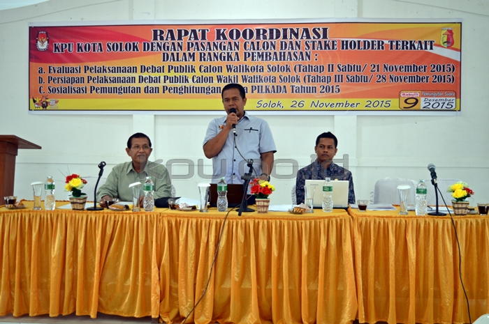 Solok, kpu-solokkota.go.id --Komisi Pemilihan Umum (KPU) Kota Solok menggelar rapat koordinasi (rakor) dengan Pasangan Calon Walikota dan Wakil Walikota Solok serta pihak terkait. Rakor ini membahas evaluasi debat publik tahap 2, Sabtu (21/11) antar Calon Wakil Walikota Solok; persiapan debat publik tahap 3, Sabtu, (28/11) antar Pasangan Calon Walikota dan Wakil Walikota Solok; dan penjelasan tatacara pemungutan dan penghitungan Suara di Tempat Pemungutan Suara (TPS), tanggal 9 Desember 2015,Kamis (26/11).