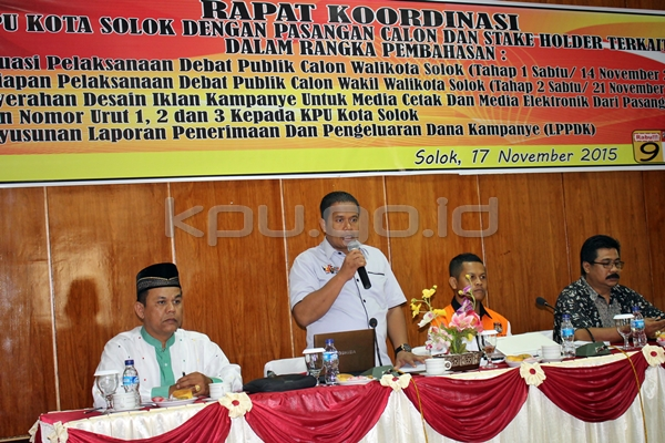 Solok, kpu-solokkota.go.id -- Komisi Pemilihan Umum (KPU) Kota Solok menggelar rapat koordinasi (rakor) dengan pihak terkait yaitu seluruh tim kampanye pasangan calon (paslon), pasangan calon walikota dan wakil walikota, Kesbangpol, Satpol PP, Linmas, Polres, Kodim, Kejari, KAN Lubuk Sikarah, LKAAM, Bundo Kanduang, Paswaslu, dan media masa cetak Kota Solok, Selasa (17/11). Rakor kali ini, membahas beberapa materi penting, yakni evaluasi pelaksanaan debat publik, persiapan pelaksanaan debat publik, penyerahan desain iklan kampanye untuk media cetak dan elektronik, serta penyusunan laporan penerimaan dan pengeluaran dana kampanye. Ketua KPU Kota Solok, Budi Santosa mengatakan bahwa rakor ini sangat penting untuk menyatukan pandangan dan melakukan evaluasi pelaksanaan debat publik tahap 1, Sabtu (14/11) dan untuk penyempurnaan pelaksanaan debat publik tahap 2, Sabtu (21/11). Disamping itu, lanjut Budi, KPU Kota Solok juga meminta kepada tim kampanye pasangan calon agar segera menyerahkan desain iklan media cetak dan media elektronik, untuk diterbitkan pada media masa cetak yang akan ditunjuk oleh KPU Kota Solok mulai tanggal 22 November hingga 5 Desember 2015. Selanjutnya Divisi Hukum KPU Kota Solok, Ilham Eka Putra menjelaskan tentang penyusunan Laporan Penerimaan dan Pengeluaran Dana Kampanye (LPPDK). LPPDK adalah pembukuan yang memuat seluruh penerimaan dan pengeluaran dana kampanye, yang harus dilaporkan kepada KPU Kota Solok paling lambat tanggal 6 Desember 2015, pukul 18.00 WIB. Selanjutnya LPPDK ini tanggal 7 Desember 2015 akan diserahkan oleh KPU Kota Solok kepada Kantor Akuntan Publik. Jenis formulir yang wajib diisi oleh tim pasangan calon antara lain: Formulir Model LPPDK1-PARPOL : Asersi atas Laporan Penerimaan dan Pengeluaran Dana Kampanye; Formulir Model LPPDK2-PARPOL : Laporan Penerimaan dan Pengeluaran Dana Kampanye; Formulir Model LPPDK3-PARPOL : Daftar Aktivitas Pengeluaran Dana Kampanye; Formulir Model LPPDK4-PARPOL : Daftar Saldo Dana Kampanye; Formulir Model LPPDK5-PARPOL : Laporan Penerimaan Sumbangan Dana Kampanye Kepada Pasangan Calon; Lampiran Formulir Model LPPDK5-PARPOL : Daftar Penerimaan Sumbangan Dana Kampanye; Surat Pernyataan Penyumbang Pihak Lain Perseorangan; Surat Pernyataan Penyumbang Pihak Lain Kelompok; Surat Pernyataan Penyumbang Pihak Lain Badan Hukum Swasta. Pada penutupan acara, Ketua KPU Kota Solok memberikan beberapa catatan penting khususnya kepada pasangan calon dan tim pasangan calon agar melakukan persiapan-persiapan seperti penunjukkan saksi per-TPS, pelaksanaan kampanye rapat umum satu kali per-pasangan calon, pengumuman Laporan Harta Kekayaan Penyelenggara Negara (LHKPN), dan penyerahan LPPDK.