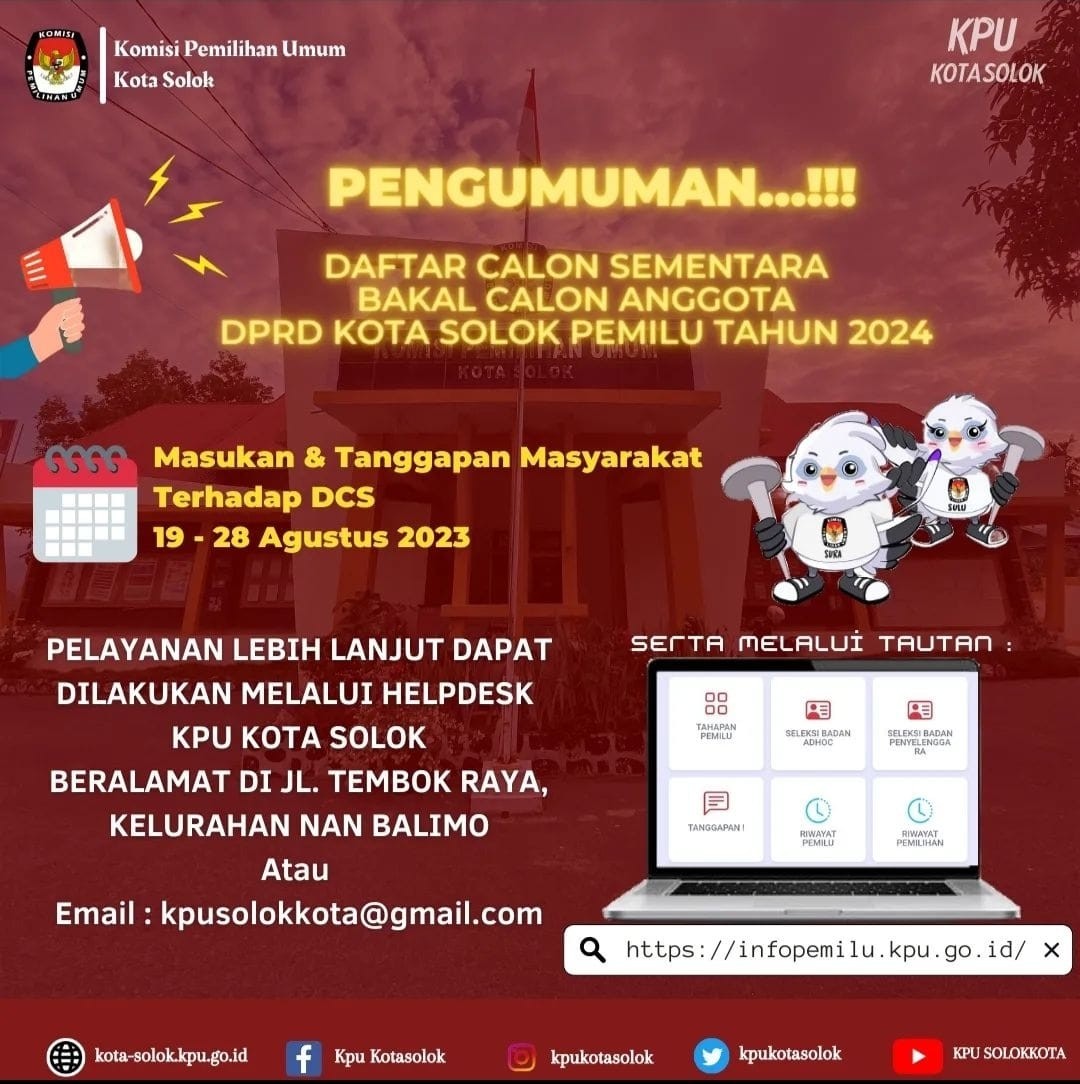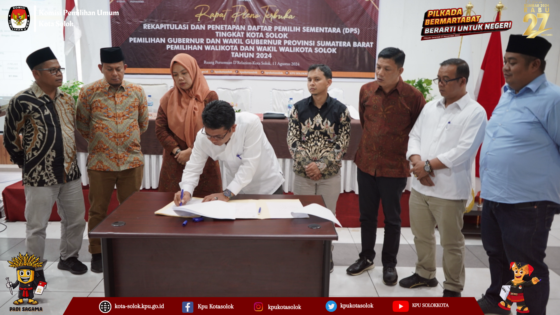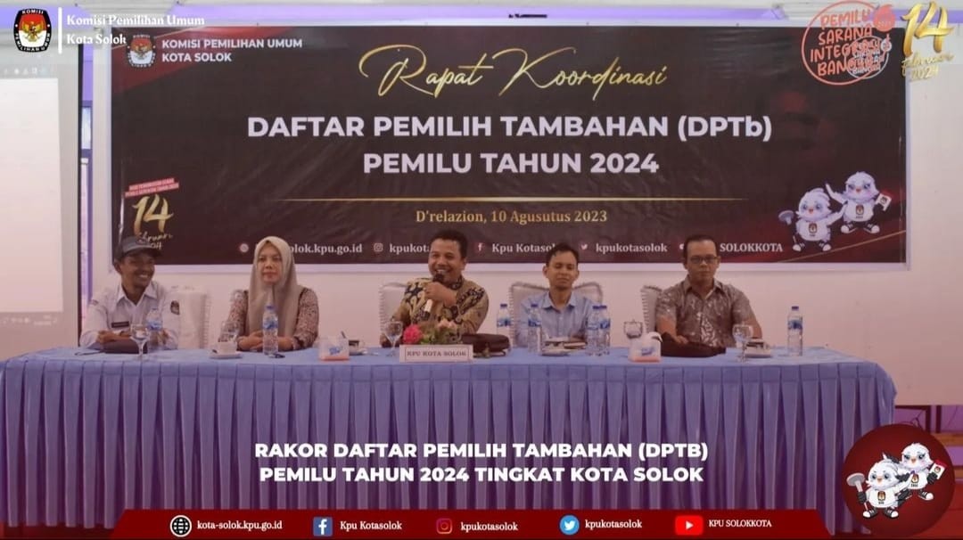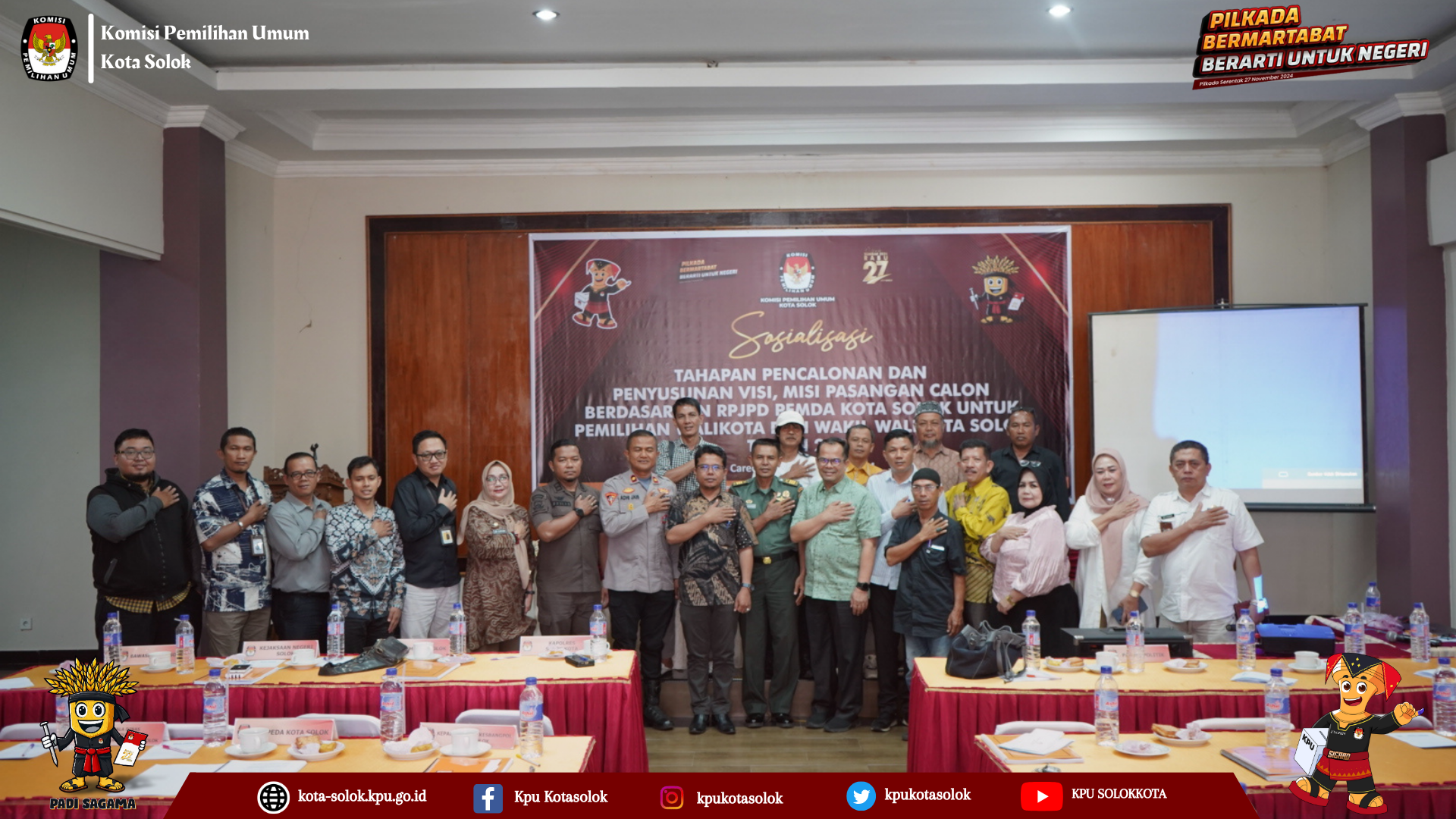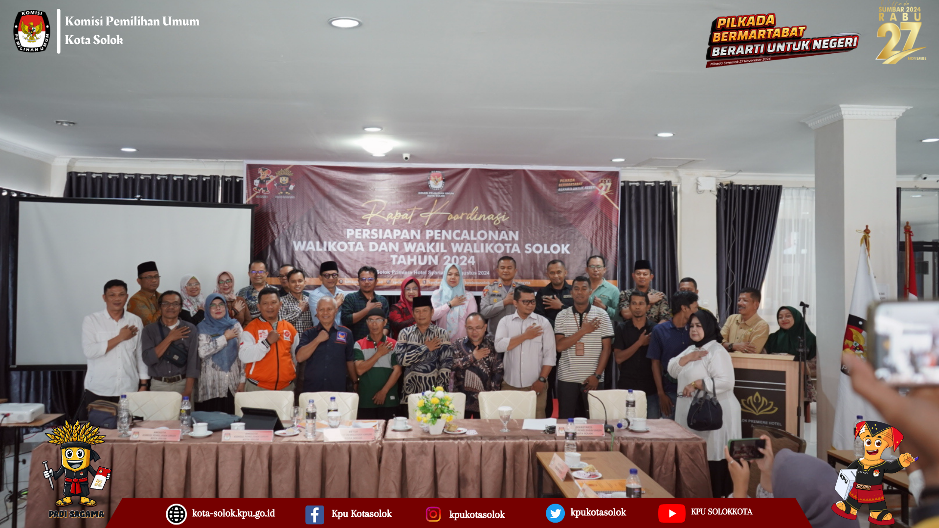 KPU Kota Solok - Jelang pendaftaran Walikota dan Wakil Walikota Solok tahun 2024, KPU Kota Solok adakan Rakor Persiapan Pencalonan Walikota dan Wakil Walikota Solok Tahun 2024, acara rapat koordinasi ini berlangsung di Premiere Hotel Solok Syariah pada hari Sabtu (10/08). Dalam sambutannya Ketua Komisi Pemilihan Umum Kota Solok menyampaikan bahwa anggota Dewan yang akan mencalonkan menjadi Calon Kepala Daerah wajib mengundurkan diri dari jabatannya. Ketua Divisi Teknis Penyelenggaraan Pemilu, Tomi Farto menjelaskan bahwa proses pendaftaran calon Kepala Daerah ini berbeda dengan Pencalonan pada Tahapan Pemilu 2024, “Syarat calon disampaikan dengan softcopy, yang nantinya akan di upload oleh petugas di KPU Kota Solok, hal ini berbeda dengan pencalonan anggota Dewan pada Pemilu 2024” Pengumuman pendaftaran pasangan calon dijadwalkan pada 24-26 Agustus 2024, selanjutnya dilanjutkan dengan pendaftaran pasangan calon pada 27-29 Agustus 2024. Pemeriksaan kesehatan calon akan dijadwalkan mulai 27 Agustus sampai dengan 2 September 2024, dan Penelitian Persyaratan Administrasi Calon dijadwalkan berlangsung mulai tanggal 29 Agustus 2024 sampai dengan 4 September 2024, Penetapan Pasangan Calon Minggu, 22 September 2024 Minggu, 22 September 2024. Ketua Divisi Teknis Penyelenggara Pemilu KPU Kota Solok, Tomi Farto menyampaikan jika Bupati/Walikota daerah lain yang akan mencalonkan menjadi Bupati/Walikota di daerah lain maka yang bersangkutan harus mengundurkan diri dari jabatannya. Sementara itu perwakilan undangan dari Polres Solok Kota menyampaikan penjelasan mengenai tata cara pengurusan SKCK yang menjadi salah satu syarat dokumen administrasi pencalonan “persyaratan untuk pengurusan SKCK antara lain Fotocopy KTP, KK, Akta Kelahiran, foto 4x6, pelayanan pengurusan SKCK akan dilayani pada pukul 08.00WIB sampai dengan pukul 14.00WIB” Tamu undangan dari pihak Disdukcapil juga menyampaikan sangat mendukung pelaksanaan Pilkada Serentak yang akan dilaksanakan pada bulan November 2024, “Dinas Dukcapil siap mendukung Pilkada Serentak Kota Solok dalam hal perekaman KTP Elektronik bahkan sejak Pemilu 2024 hingga Pilkada Serentak Tahun 2024, kami sudah siap melakukan pencetakan KTP untuk Siswa Siswi yang pada hari H Pilkada berumur 17 Tahun, kami siap mendukung pelaksanaannya” Kami berharap acara ini merupakan titik awal dan landasan kita untuk masa pendaftaran nanti semuanya berjalan dengan lancer, ujar Ketua KPU Kota Solok pada Sesi Penutupan.
