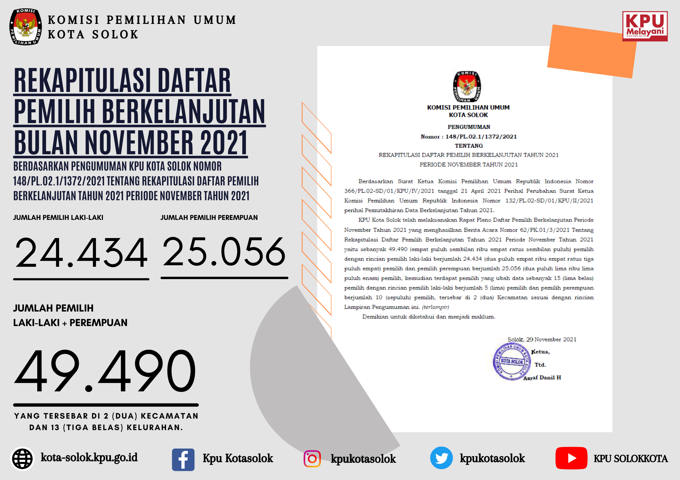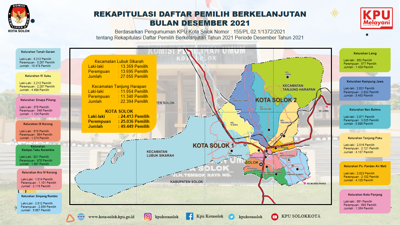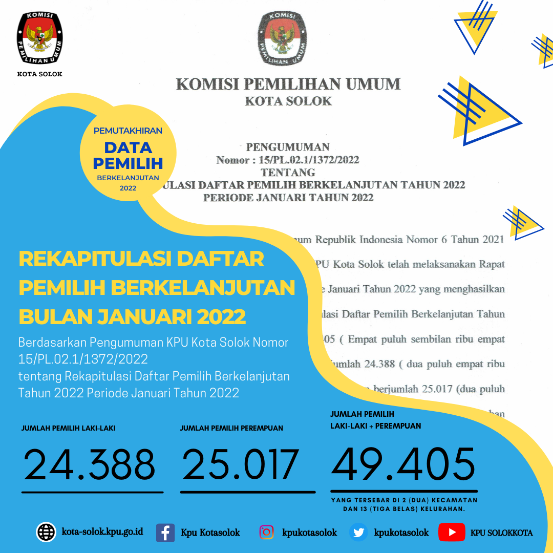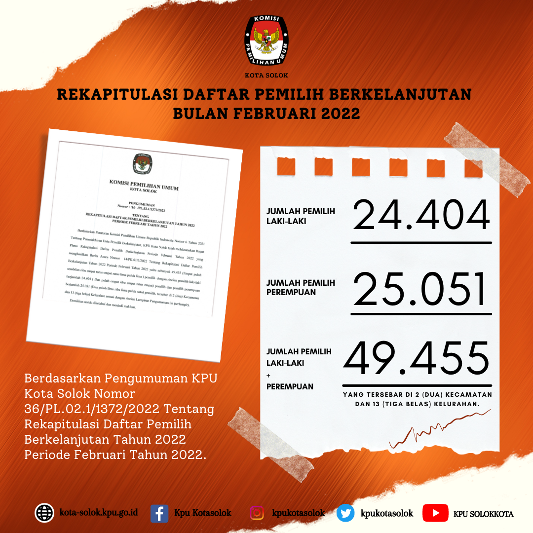 Pengumuman Komisi Pemilihan Umum Kota Solok Nomor : 15/PL.02.1/1372/2022 tentang Rekapitulasi Daftar Pemilih Berkelanjutan Tahun 2022 Periode Februari Tahun 2022, dapat dilihat/download disini dan Daftar Perubahan Pemilih Hasil Pemutakhiran Data Pemilih Berkelanjutan Bulan Februari Tahun 2022 dapat dilihat/didownload disini