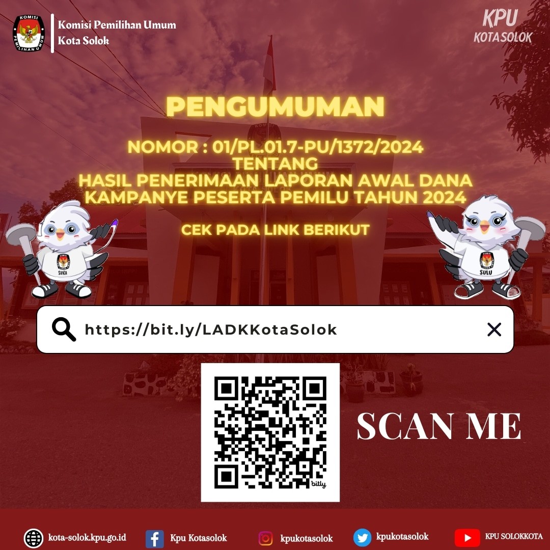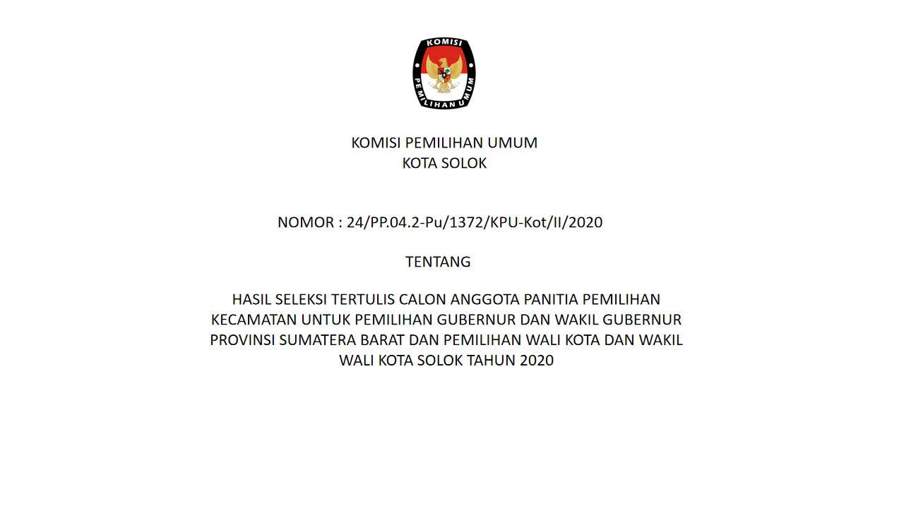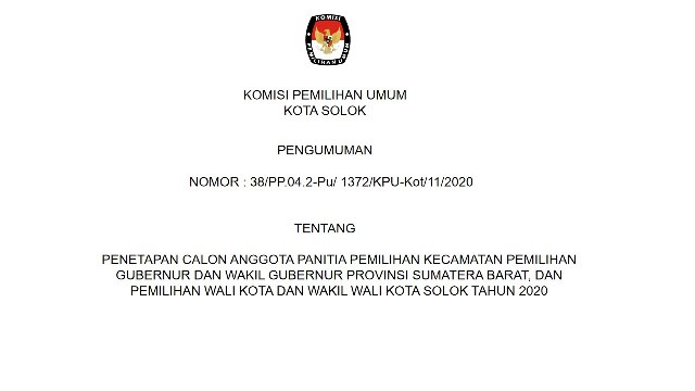 PENGUMUMANPENDAFTARAN LEMBAGA PEMANTAU PEMILIHAN, SURVEI ATAU JAJAK PENDAPAT DAN PENGHITUNGAN CEPAT PEMILIHAN WALI KOTA DAN WAKIL WALI KOTA SOLOK TAHUN 2020download disini https://drive.google.com/open?id=1pbJOOdCgy94Ouh0xaMnAI0X-46GTrLR8