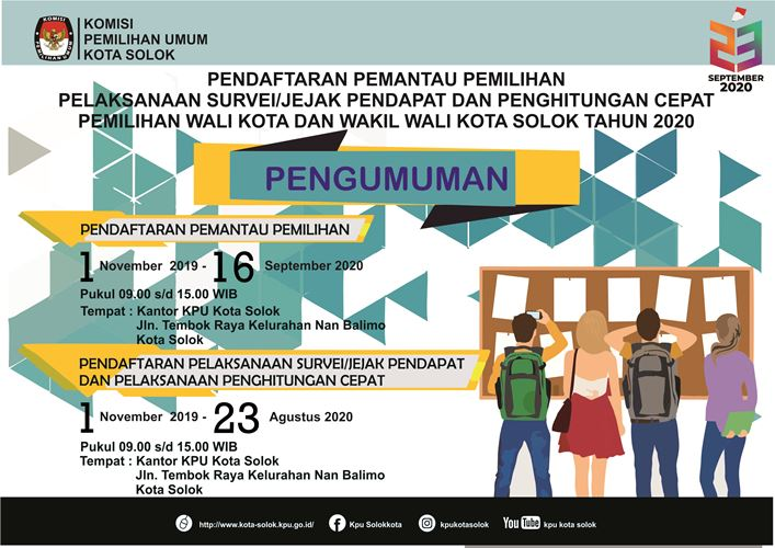 Berdasarkan Peraturan Komisi Pemilihan Umum Nomor 15 Tahun 2019 tentang Tahapan, Program dan Jadwal Penyelenggaraan Pemilihan Gubernur dan Wakil Gubernur, Bupati dan Wakil Bupati, dan/atau Walikota dan Wakil Walikota Tahun 2020 dan Keputusan Komisi Pemilihan Umum Kota Solok Nomor 85/HK.03.1-Kpt/1372/KPU-Kot/IX/2019 tentang Pedoman Teknis Tahapan, Program dan Jadwal Penyelenggaraan Pemilihan Wali Kota dan Wakil Wali Kota Solok Tahun 2020, KPU Kota Solok membuka pendaftaran Lembaga pemantauan pemilihan, Lembaga Pelaksana Survei atau Jajak Pendapat dan Penghitungan Cepat Hasil Pemilihan Wali Kota dan Wakil Wali Kota Solok Tahun 2020