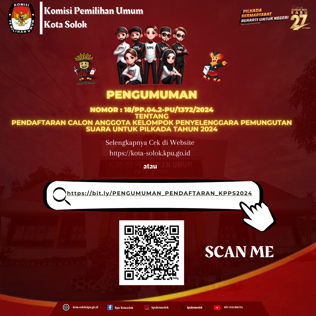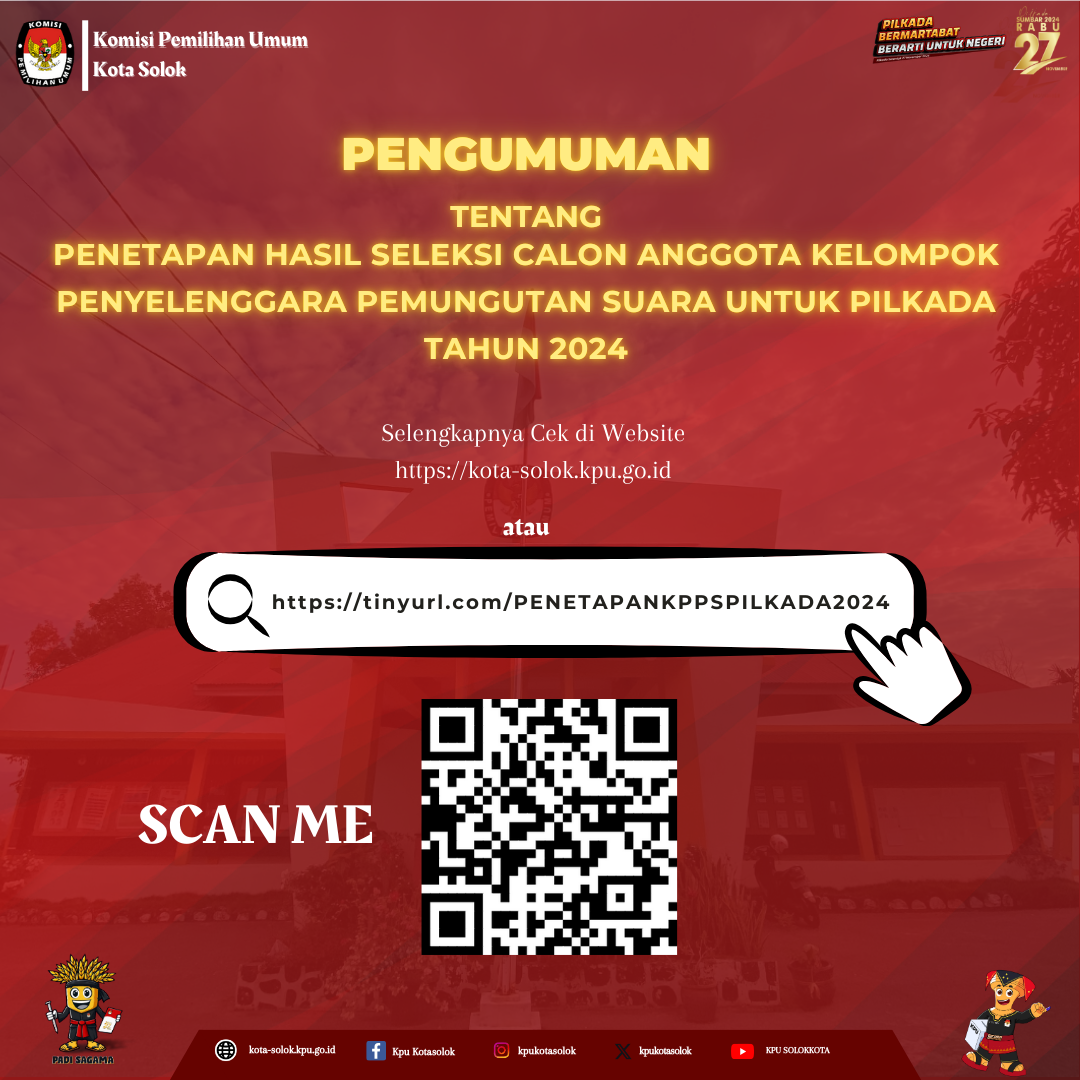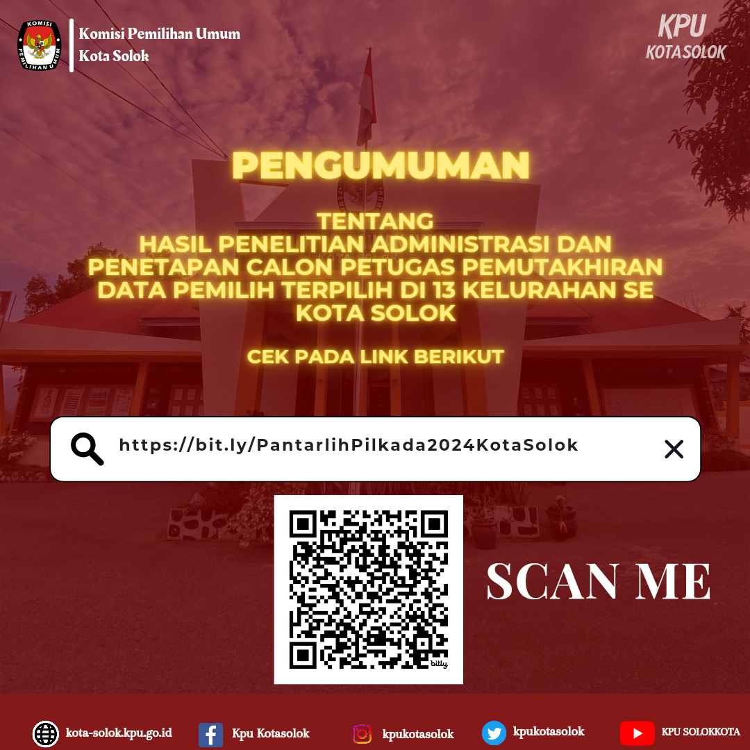 #TemanPemilih, Berikut merupakan Pengumuman tentang Hasil Penelitian Administrasi dan Penetapan Calon Petugas Pemutakhiran Data Pemilih di 13 Kelurahan Se Kota Solok. Silahkan lampiran diunduh pada link tersebut atau melalui QR Scan dan juga dapat dilihat pada website KPU Kota Solok.