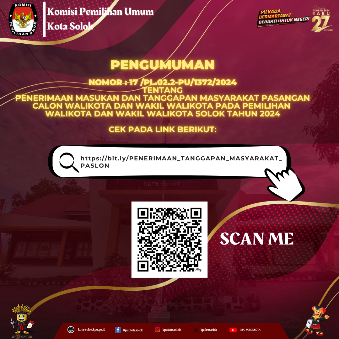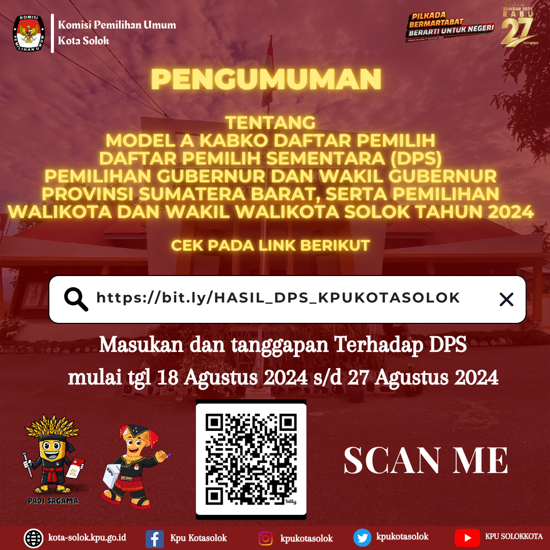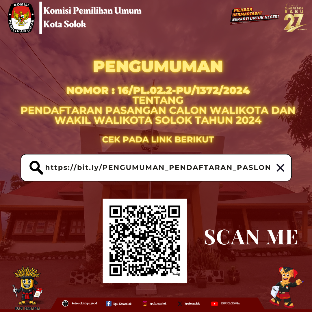 #TemanPemilih, Berikut merupakan Pengumuman tentang Hasil Penelitian Administrasi dan Penetapan Calon Petugas Pemutakhiran Data Pemilih di 13 Kelurahan Se Kota Solok. Silahkan lampiran diunduh pada link tersebut atau melalui QR Scan dan juga dapat dilihat pada website KPU Kota Solok.
