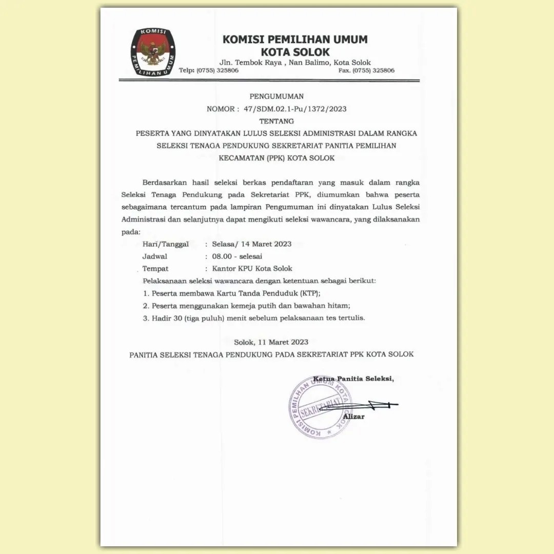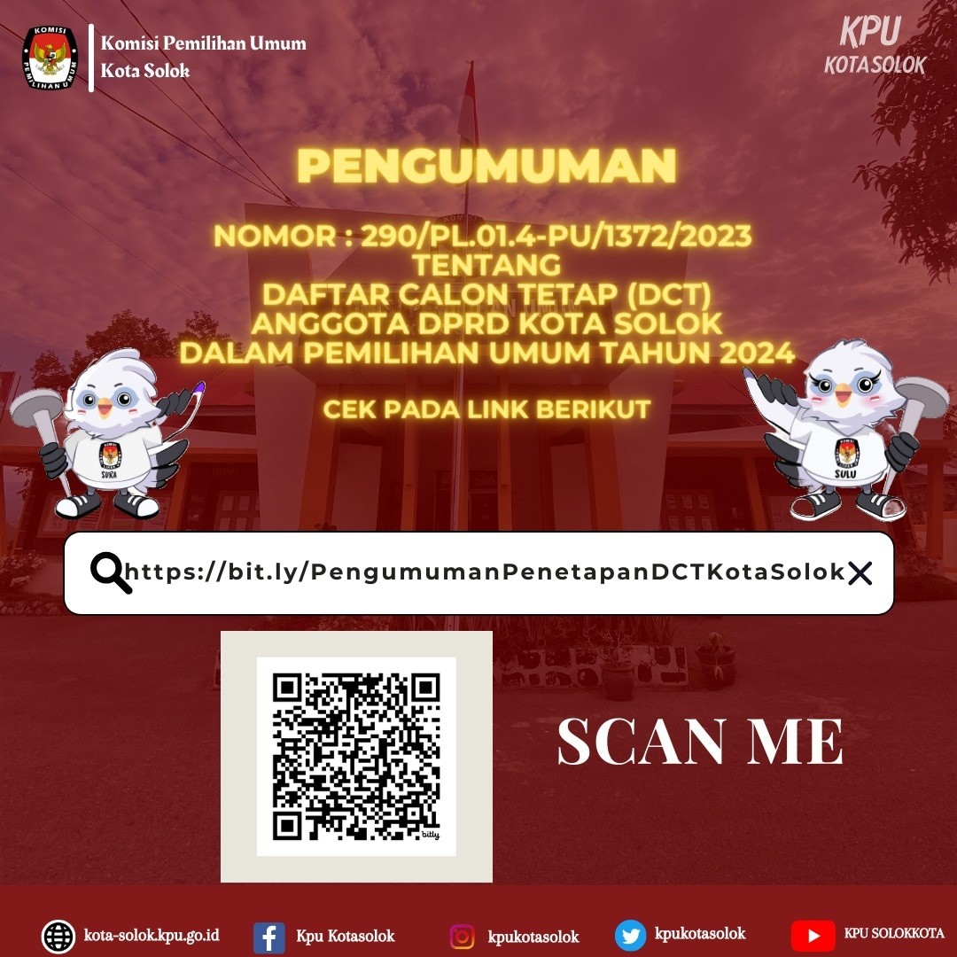 #TemanPemilih, sesuai dengan ketentuan Pasal 70 PKPU Nomor 10 Tahun 2023 tentang Pencalonan Anggota DPR, DPRD Provinsi dan DPRD Kab/Kota, maka KPU Kota Solok mengumumkan Daftar Calon Sementara (DCS) anggota DPRD Kota Solok dan Persentase Keterwakilan Perempuan dalam DCS, mulai tanggal 19-23 Agustus 2023