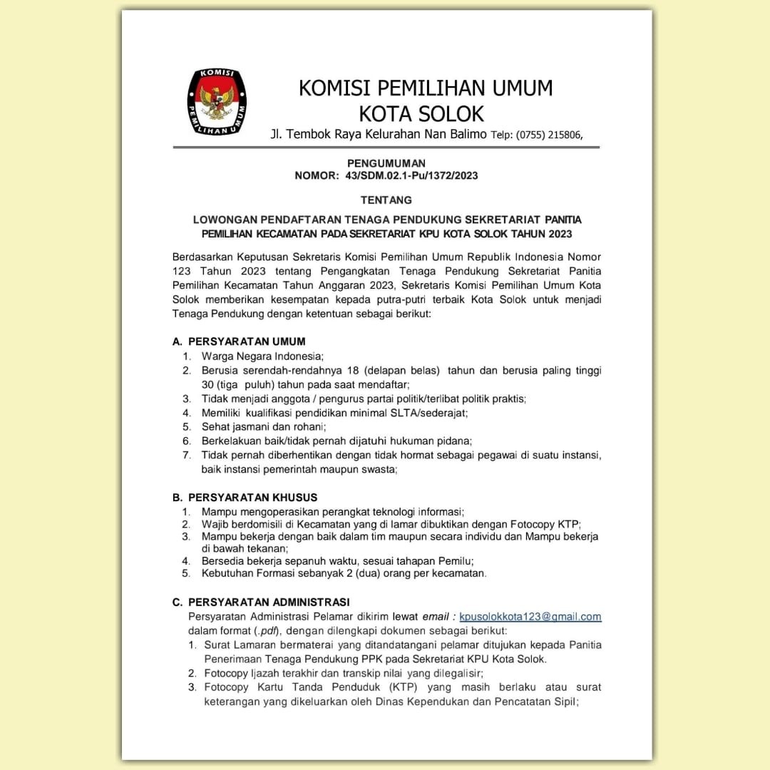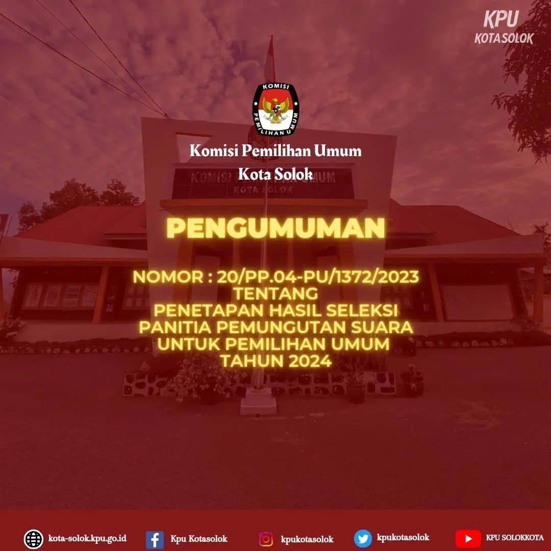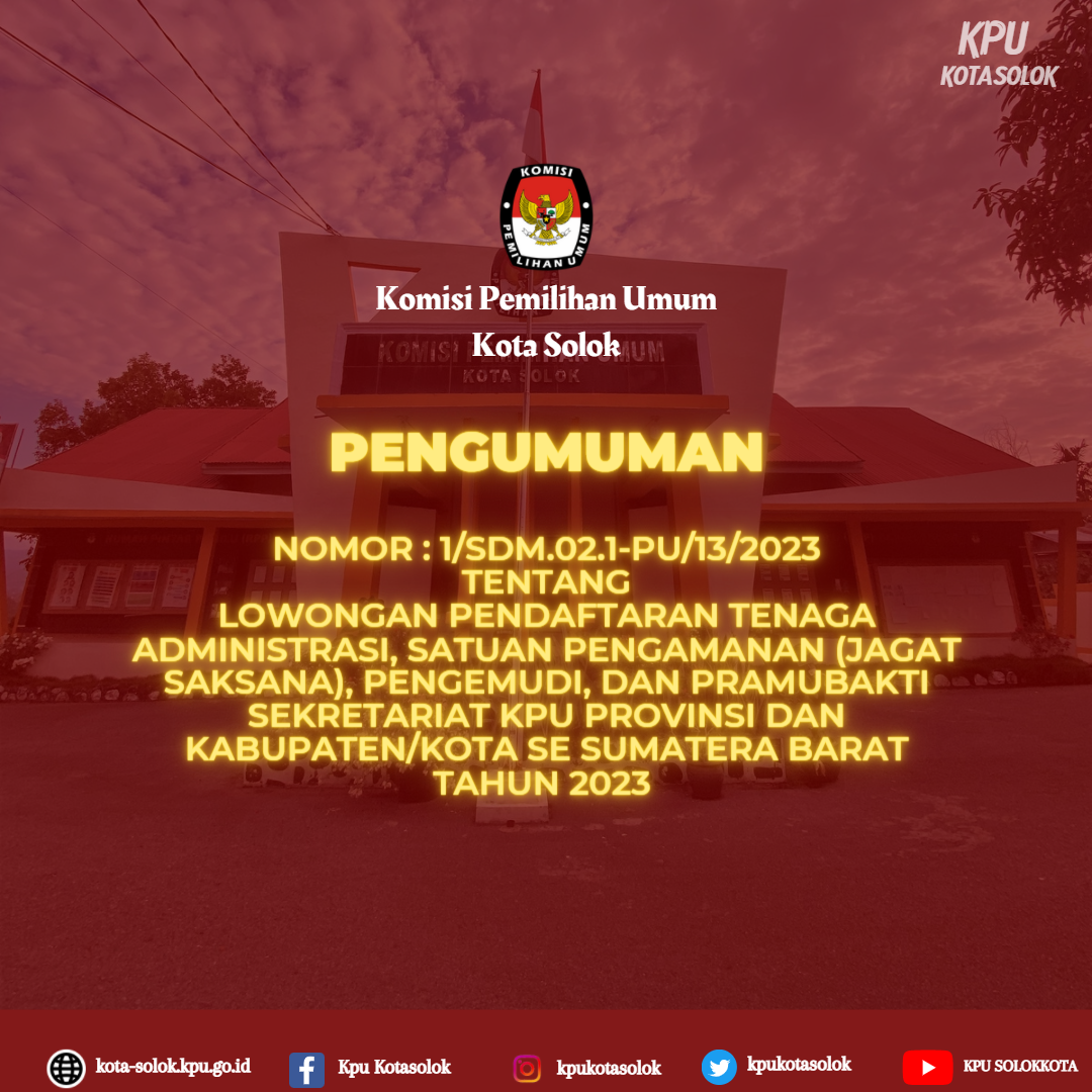 BERIKUT MERUPAKAN PENGUMUMAN YANG DITERBITKAN OLEH KPU PROVINSI SUMATERA BARAT NOMOR: 1 /SDM.02.1-Pu/13/2023 TENTANG LOWONGAN PENDAFTARAN TENAGA ADMINISTRASI, SATUAN PENGAMANAN (JAGAT SAKSANA), PENGEMUDI, DAN PRAMUBAKTI SEKRETARIAT KOMISI PEMILIHAN UMUM PROVINSI SUMATERA BARAT DAN SEKRETARIAT KOMISI PEMILIHAN UMUM KABUPATEN/KOTA SE-PROVINSI SUMATERA BARAT TAHUN 2023. UNTUK PENGUMUMAN DAN LAMPIRAN DOKUMEN DUKUNGAN PERSYARATAN ADMINISTRASI DAPAT DIUNDUH PADA TAUTAN DI BAWAH.