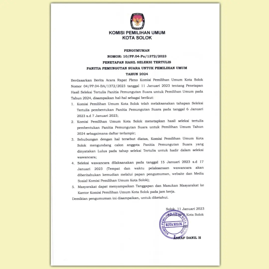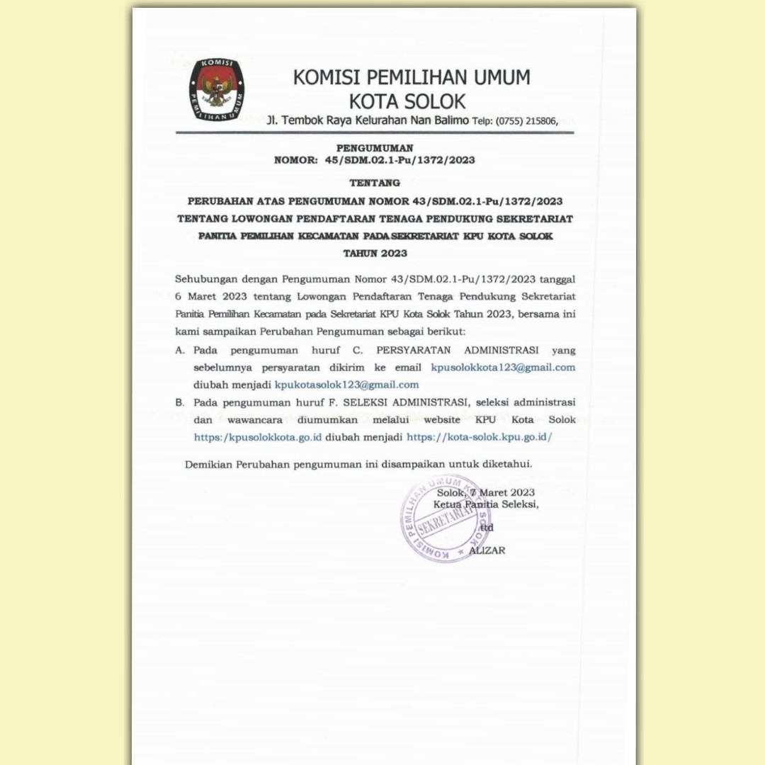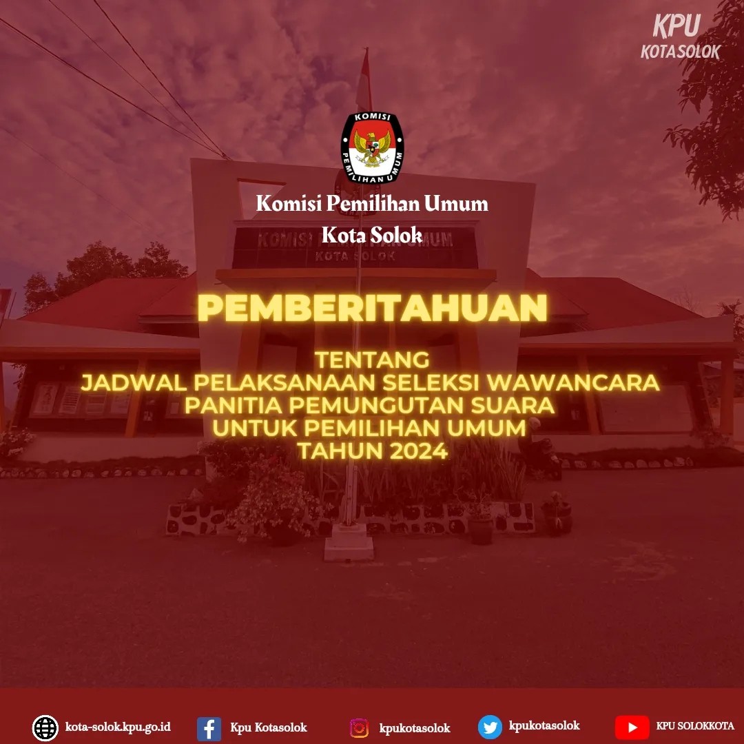 BERIKUT MERUPAKAN PENGUMUMAN YANG DITERBITKAN OLEH KPU PROVINSI SUMATERA BARAT NOMOR: 1 /SDM.02.1-Pu/13/2023 TENTANG LOWONGAN PENDAFTARAN TENAGA ADMINISTRASI, SATUAN PENGAMANAN (JAGAT SAKSANA), PENGEMUDI, DAN PRAMUBAKTI SEKRETARIAT KOMISI PEMILIHAN UMUM PROVINSI SUMATERA BARAT DAN SEKRETARIAT KOMISI PEMILIHAN UMUM KABUPATEN/KOTA SE-PROVINSI SUMATERA BARAT TAHUN 2023. UNTUK PENGUMUMAN DAN LAMPIRAN DOKUMEN DUKUNGAN PERSYARATAN ADMINISTRASI DAPAT DIUNDUH PADA TAUTAN DI BAWAH.